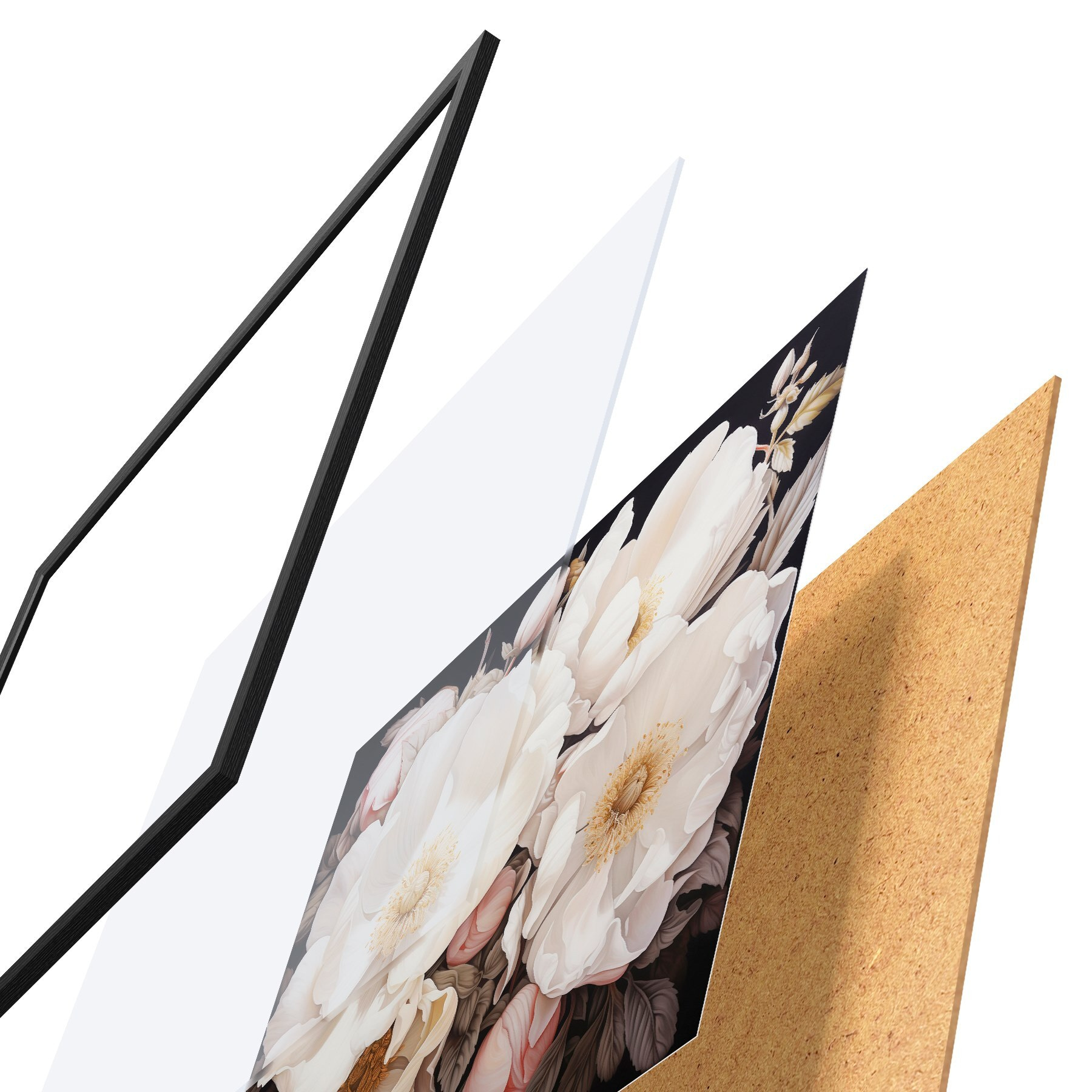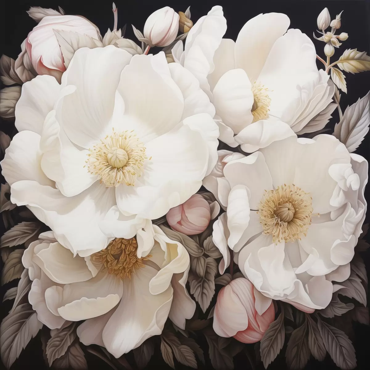Poster Weiße Pfingstrose Blumen auf einem dunklen Hintergrund in Acrylmalerei Stil Nr f43379