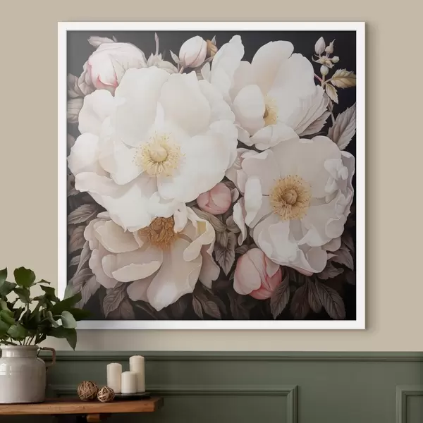 Poster Weiße Pfingstrose Blumen auf einem dunklen Hintergrund in Acrylmalerei Stil f43379