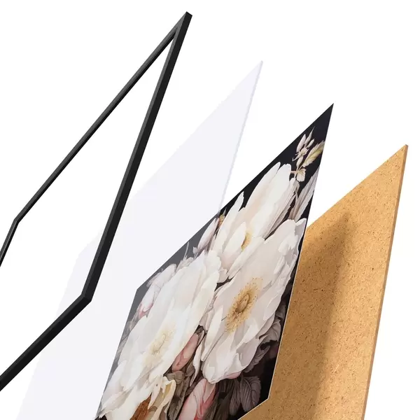 Das Poster besteht aus einem Rahmen, Plexiglas, einem gedruckten Bild und einer Rückwand aus Spanplatten. Dank der Halterungen auf der Rückseite kann das Poster sofort an die Wand gehängt werden.