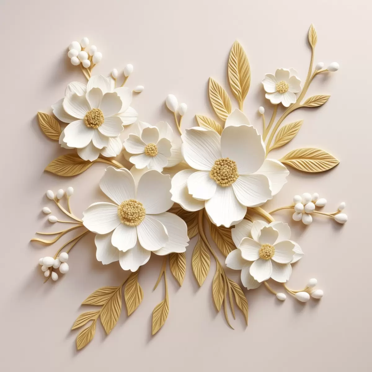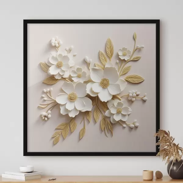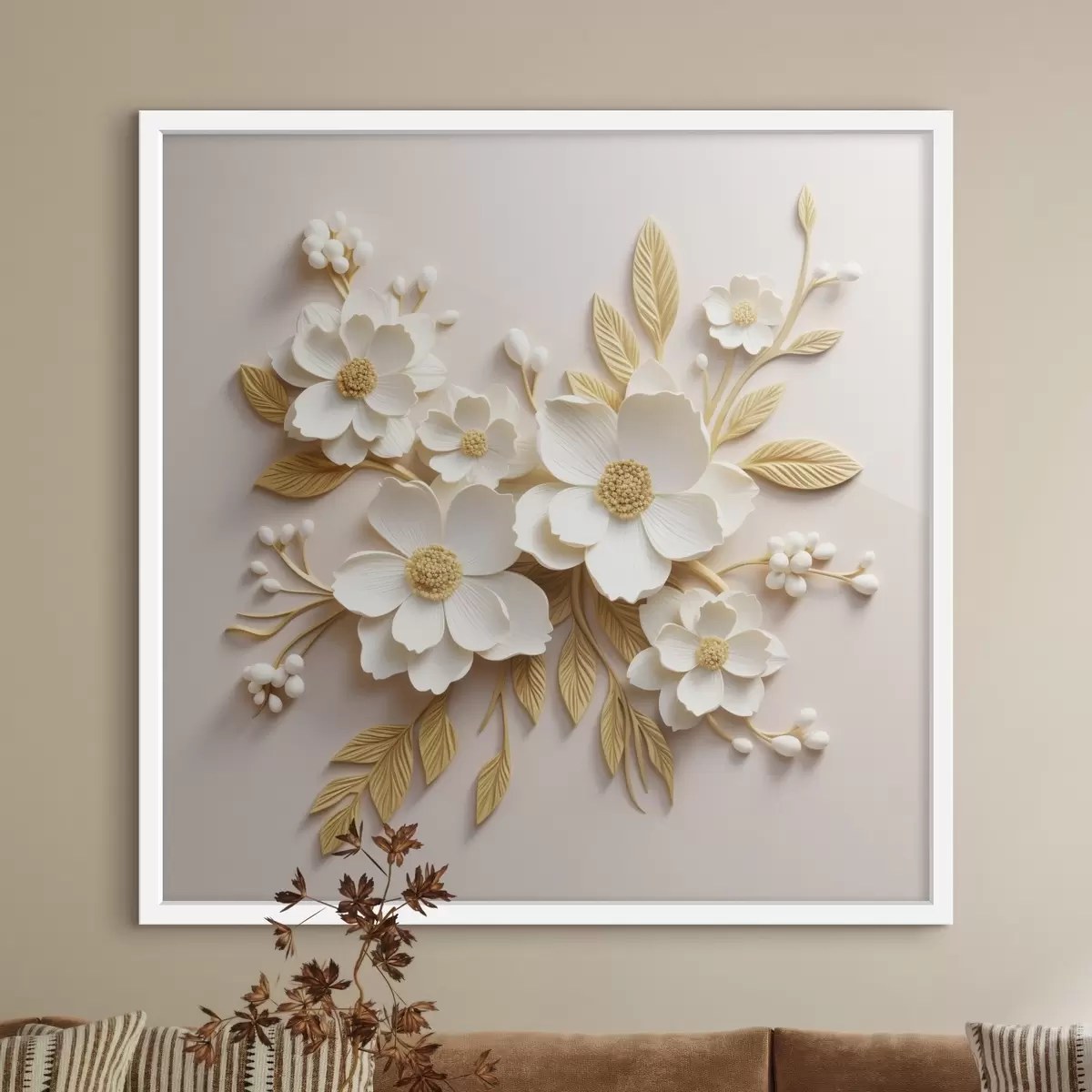 Poster 3D weiße Blumen mit Blättern auf einem cremefarbenen Hintergrund Nr f43383
