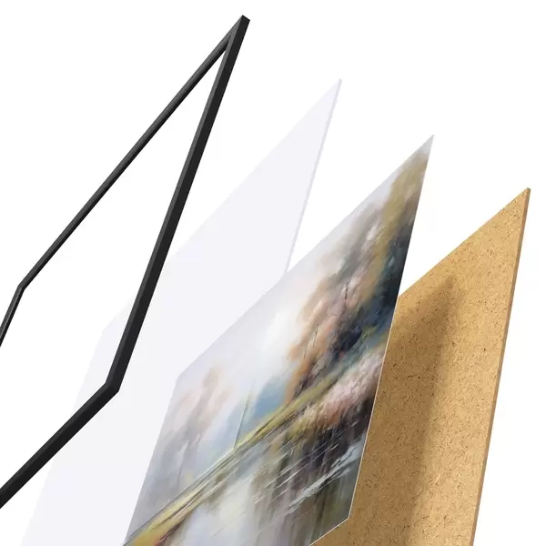 Das Poster besteht aus einem Rahmen, Plexiglas, einem gedruckten Bild und einer Rückwand aus Spanplatten. Dank der Halterungen auf der Rückseite kann das Poster sofort an die Wand gehängt werden.