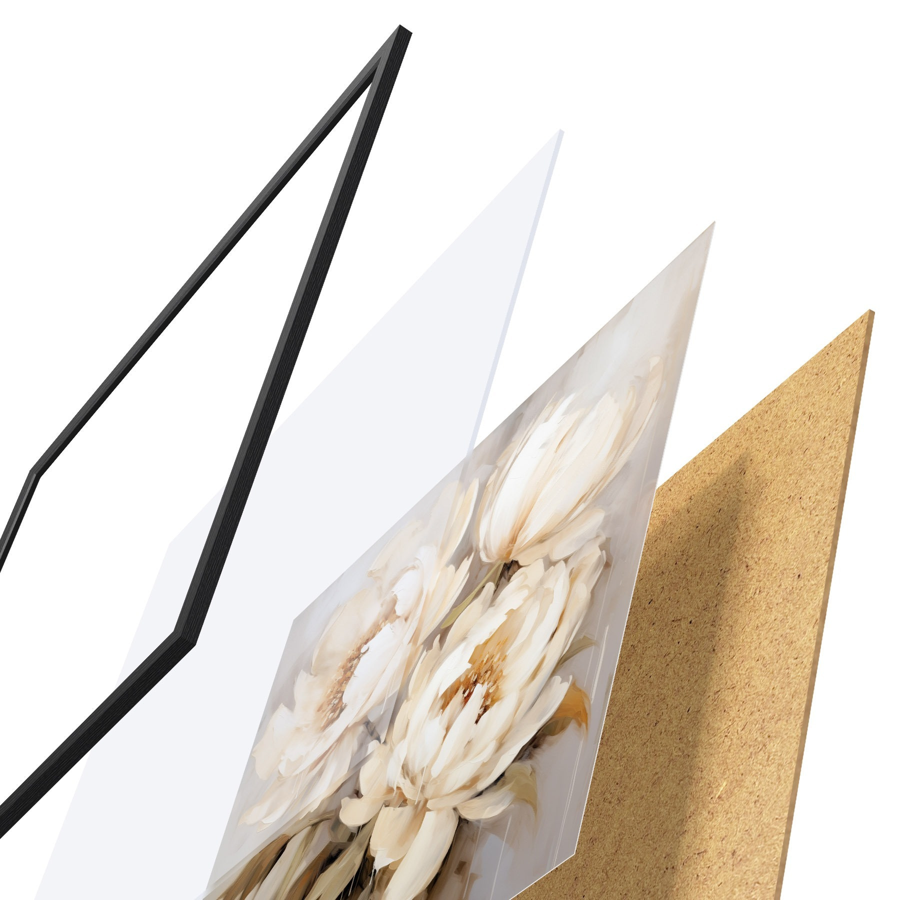 Das Poster besteht aus einem Rahmen, Plexiglas, einem gedruckten Bild und einer Rückwand aus Spanplatten. Dank der Halterungen auf der Rückseite kann das Poster sofort an die Wand gehängt werden.