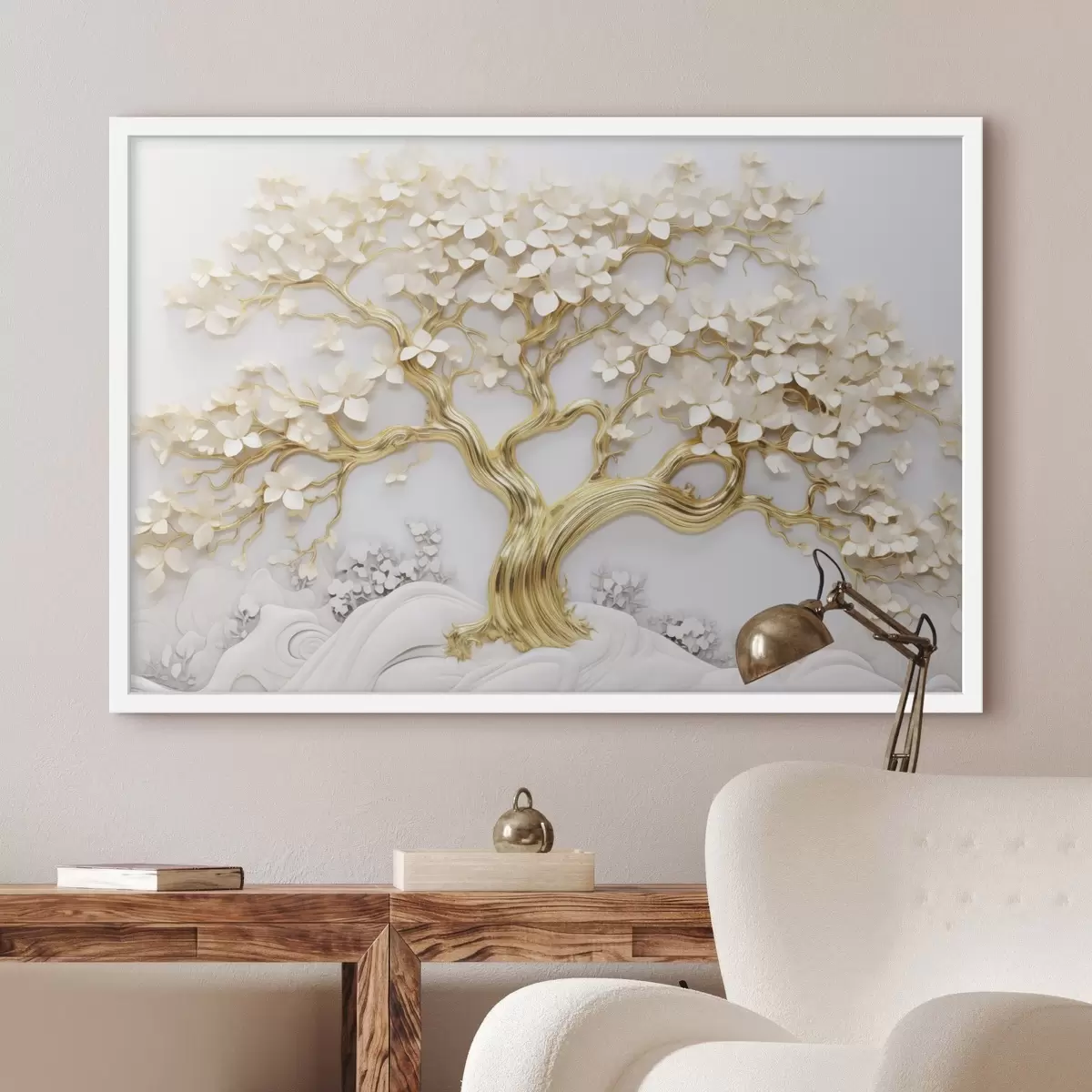 Poster Dekorativer Baum mit weißen Blumen, weißer Hintergrund, weiße Felsen, komplizierte Details, von der Natur inspirierte Kunst f43388