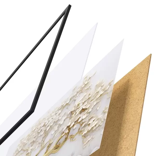 Das Poster besteht aus einem Rahmen, Plexiglas, einem gedruckten Bild und einer Rückwand aus Spanplatten. Dank der Halterungen auf der Rückseite kann das Poster sofort an die Wand gehängt werden.