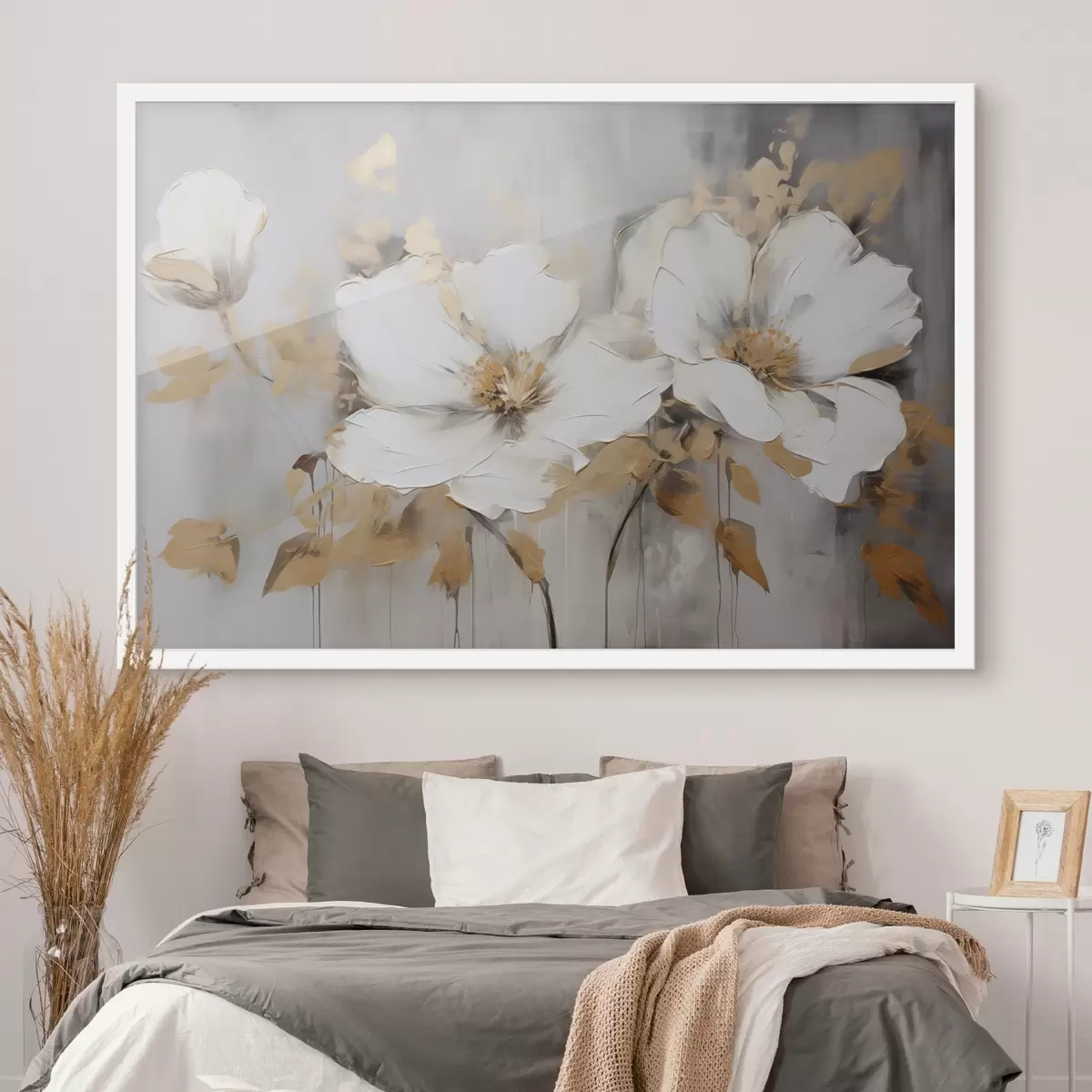 Poster Weiße Blumen mit gelben Blättern auf einem weißen Hintergrund, dicke Pinselstriche Nachahmung, strukturierten modernen Stil f43389