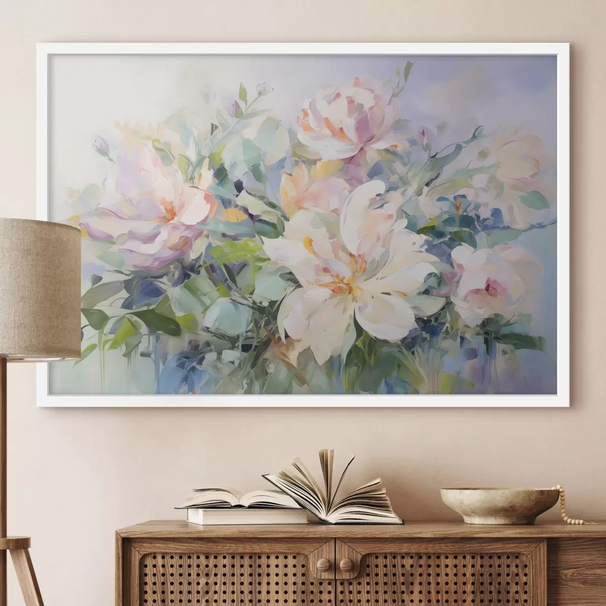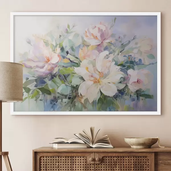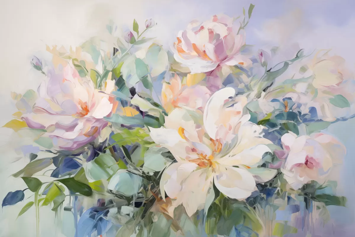 Poster Ein Blumenarrangement mit pastellfarbenen Blumen und blauen Blättern, Ölgemälde-Imitation Nr f43390