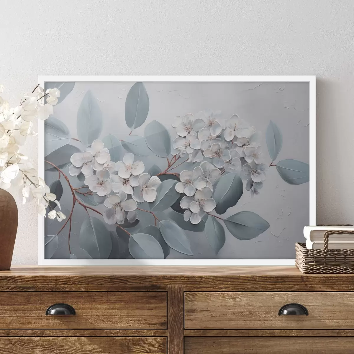Poster Ein Zweig mit weißen Hortensienblüten in voller Blüte, mit blauen Blättern auf hellgrauem Hintergrund, Ölgemälde f43391