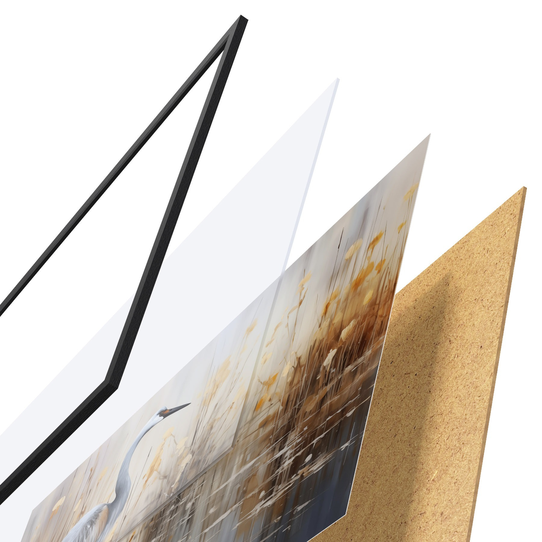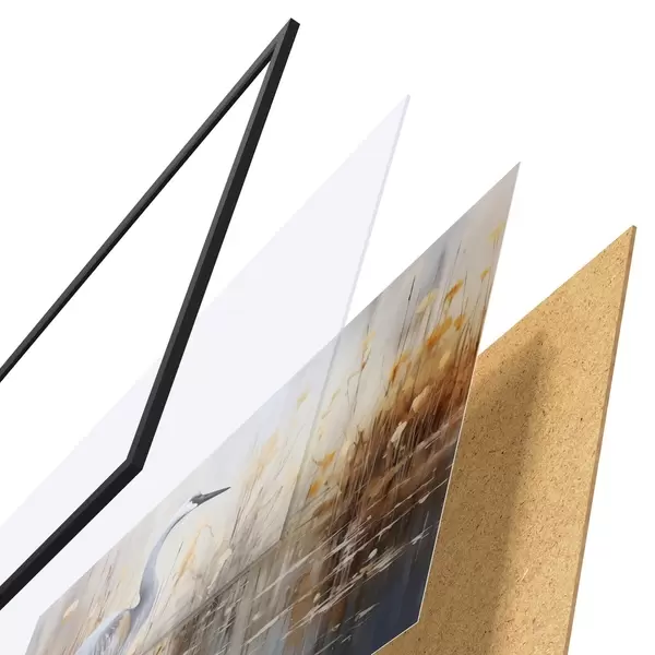 Das Poster besteht aus einem Rahmen, Plexiglas, einem gedruckten Bild und einer Rückwand aus Spanplatten. Dank der Halterungen auf der Rückseite kann das Poster sofort an die Wand gehängt werden.