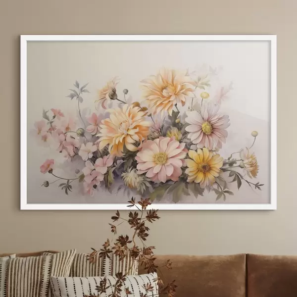 Poster Eine Sammlung von rosa, gelben und orangefarbenen Blumen, hellen Hintergrund, weiche Farben, Vintage-Stil, botanische Illustration f43401