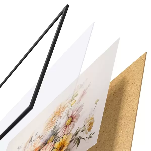 Das Poster besteht aus einem Rahmen, Plexiglas, einem gedruckten Bild und einer Rückwand aus Spanplatten. Dank der Halterungen auf der Rückseite kann das Poster sofort an die Wand gehängt werden.