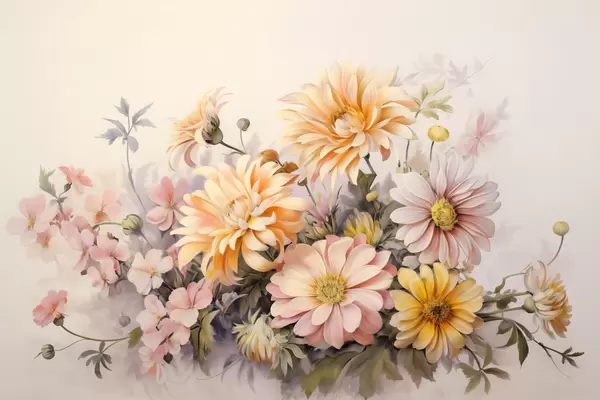Poster Eine Sammlung von rosa, gelben und orangefarbenen Blumen, hellen Hintergrund, weiche Farben, Vintage-Stil, botanische Illustration f43401