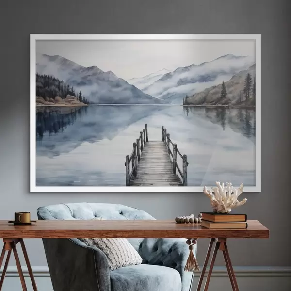 Poster Ein hölzerner Steg ragt in einen ruhigen See hinaus, umgeben von Bergen und immergrünen Bäumen, Aquarellstil Nr f43405