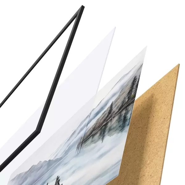 Das Poster besteht aus einem Rahmen, Plexiglas, einem gedruckten Bild und einer Rückwand aus Spanplatten. Dank der Halterungen auf der Rückseite kann das Poster sofort an die Wand gehängt werden.