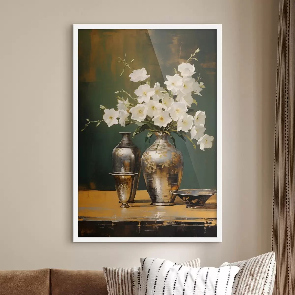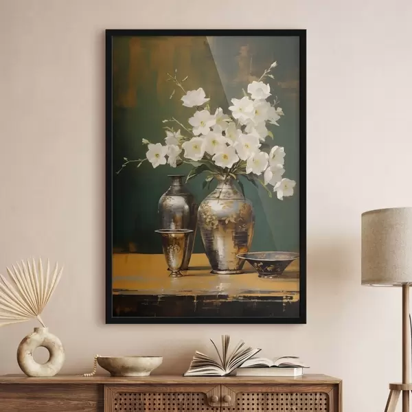 Poster Ein Stillleben mit weißen Blumen in einer Vase, mit dekorativen Vasen und einer Schale auf einem grünen Tisch, dunkelgrüner Hintergrund Nr f43408