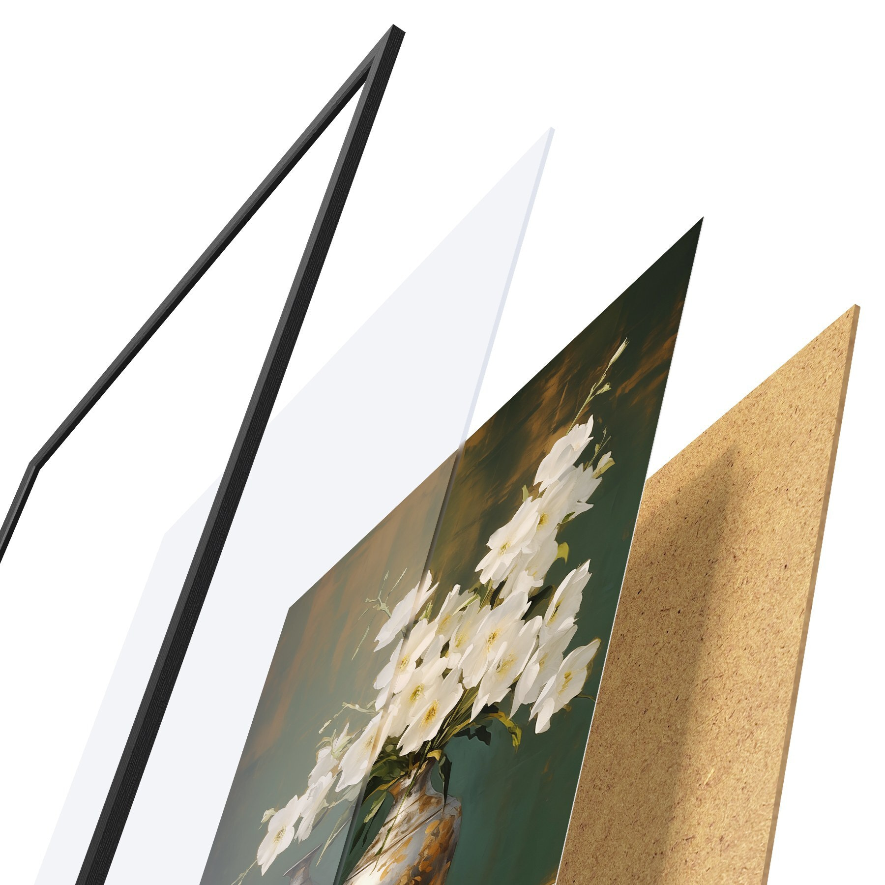 Das Poster besteht aus einem Rahmen, Plexiglas, einem gedruckten Bild und einer Rückwand aus Spanplatten. Dank der Halterungen auf der Rückseite kann das Poster sofort an die Wand gehängt werden.