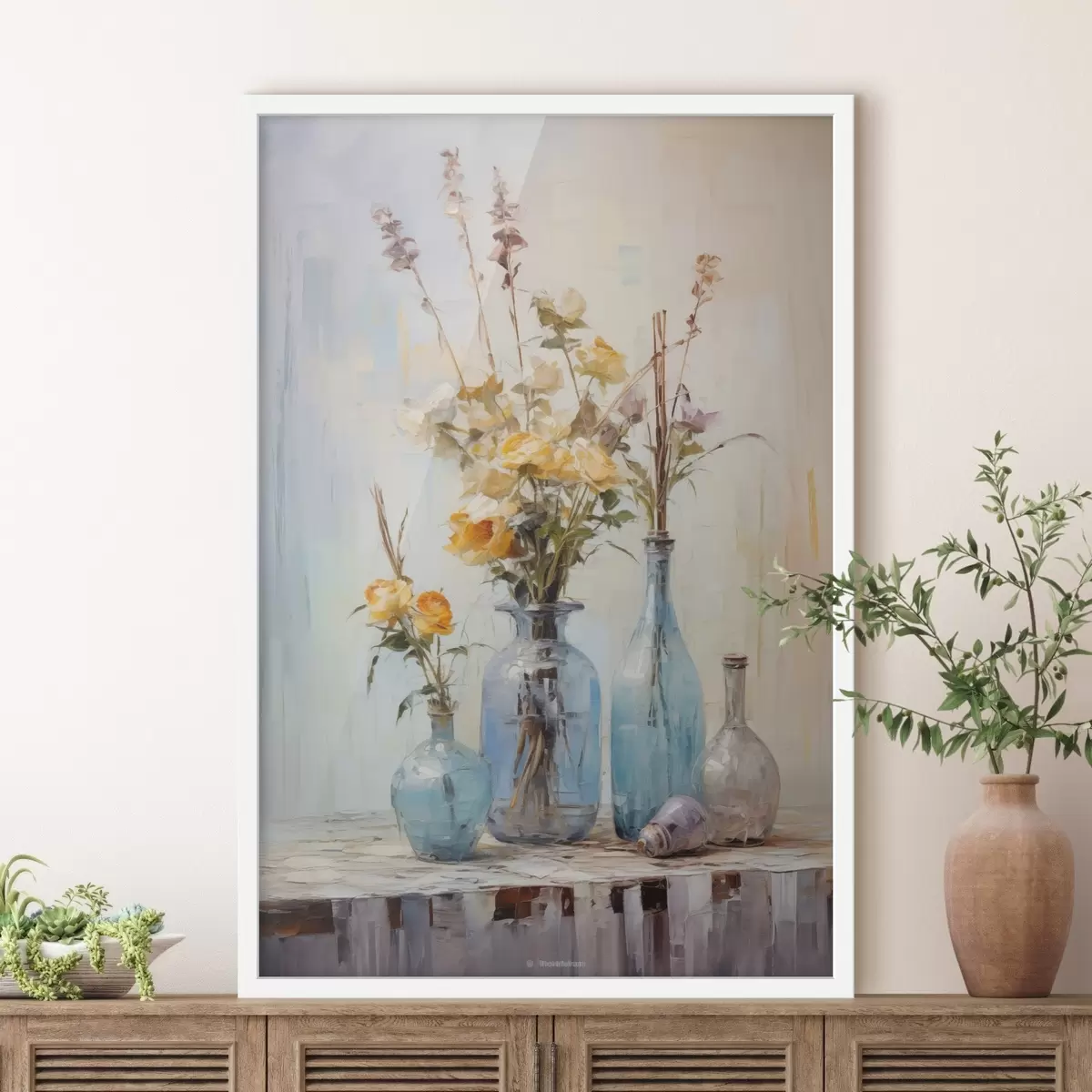 Poster Ein Stillleben mit gelben Rosen in blauen Glasvasen, heller strukturierter Hintergrund, weiche Pinselstriche, Ölgemälde-Stil f43409