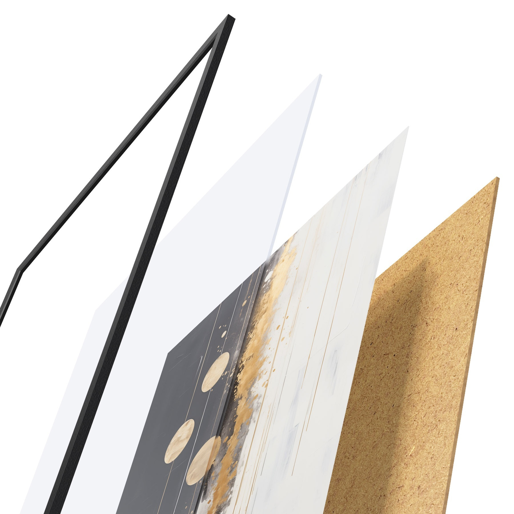 Das Poster besteht aus einem Rahmen, Plexiglas, einem gedruckten Bild und einer Rückwand aus Spanplatten. Dank der Halterungen auf der Rückseite kann das Poster sofort an die Wand gehängt werden.