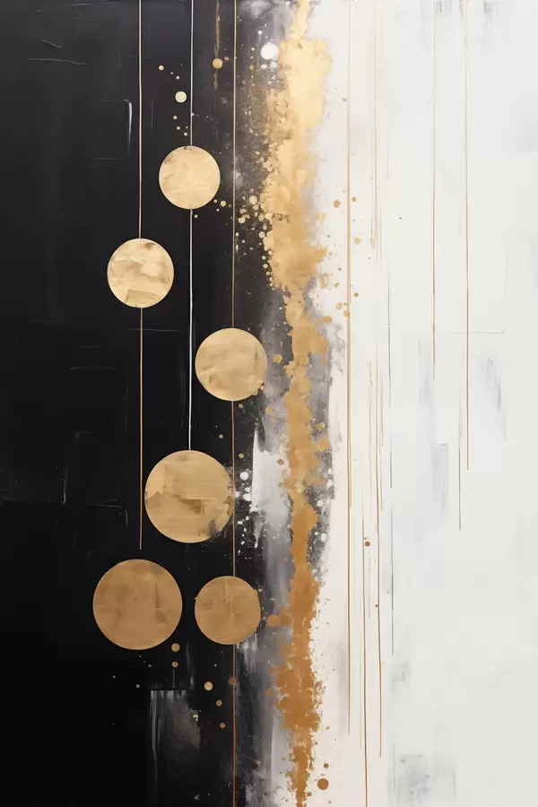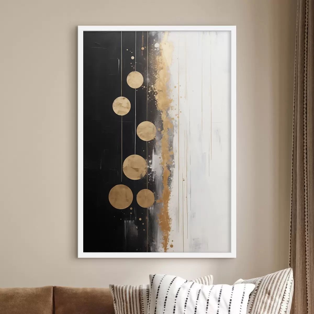 Poster Abstrakte Kunst mit gelben Kreisen auf schwarzem und weißem Hintergrund mit weißen und gelben Flecken hängen Nr f43410