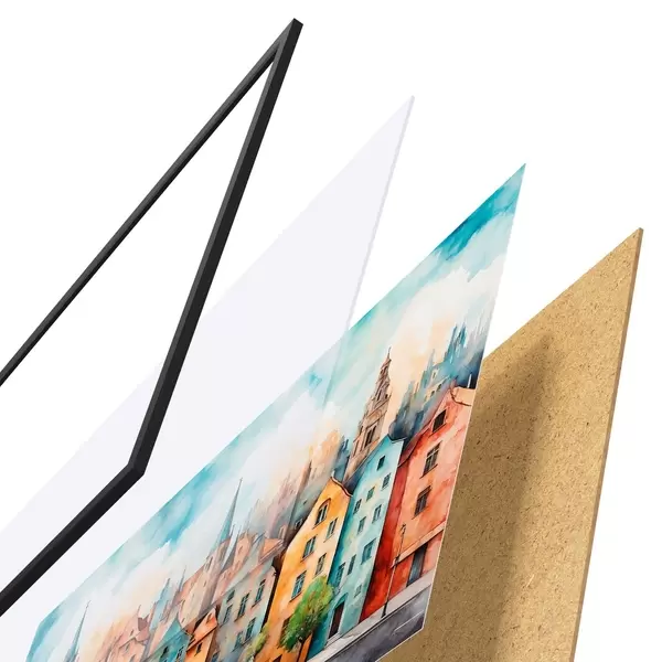 Das Poster besteht aus einem Rahmen, Plexiglas, einem gedruckten Bild und einer Rückwand aus Spanplatten. Dank der Halterungen auf der Rückseite kann das Poster sofort an die Wand gehängt werden.
