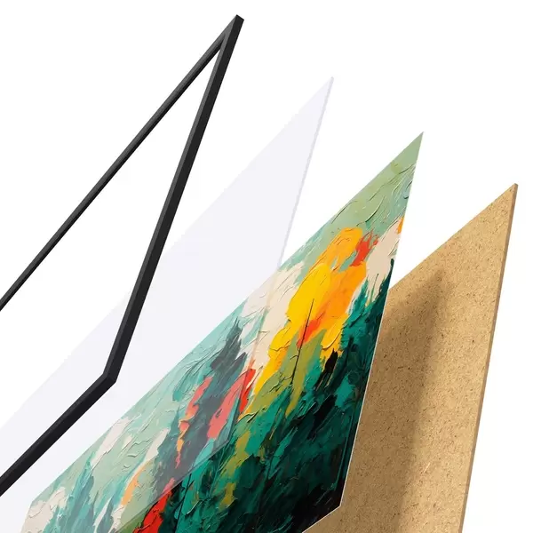 Das Poster besteht aus einem Rahmen, Plexiglas, einem gedruckten Bild und einer Rückwand aus Spanplatten. Dank der Halterungen auf der Rückseite kann das Poster sofort an die Wand gehängt werden.