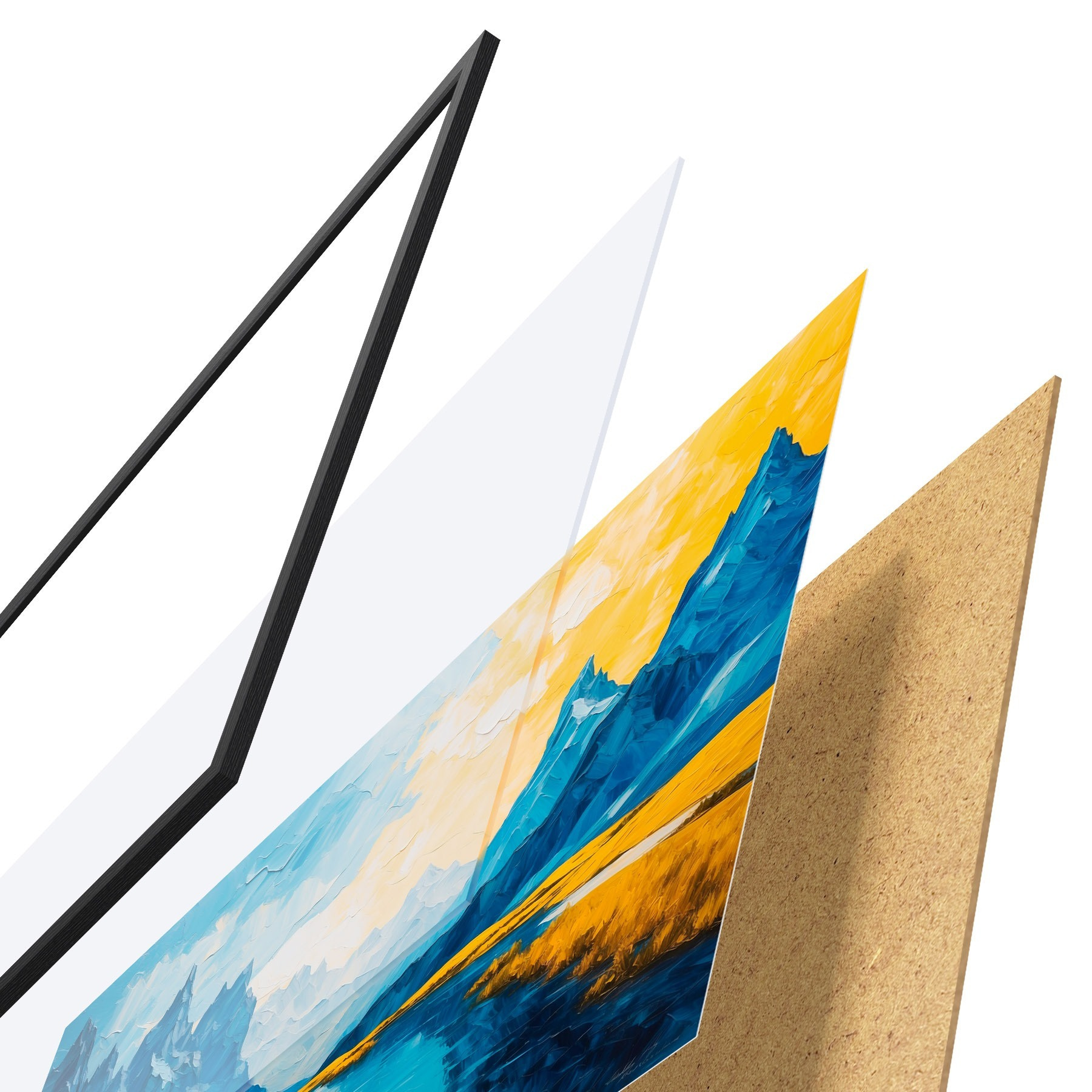 Das Poster besteht aus einem Rahmen, Plexiglas, einem gedruckten Bild und einer Rückwand aus Spanplatten. Dank der Halterungen auf der Rückseite kann das Poster sofort an die Wand gehängt werden.