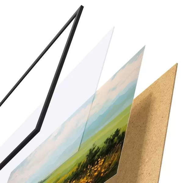 Das Poster besteht aus einem Rahmen, Plexiglas, einem gedruckten Bild und einer Rückwand aus Spanplatten. Dank der Halterungen auf der Rückseite kann das Poster sofort an die Wand gehängt werden.