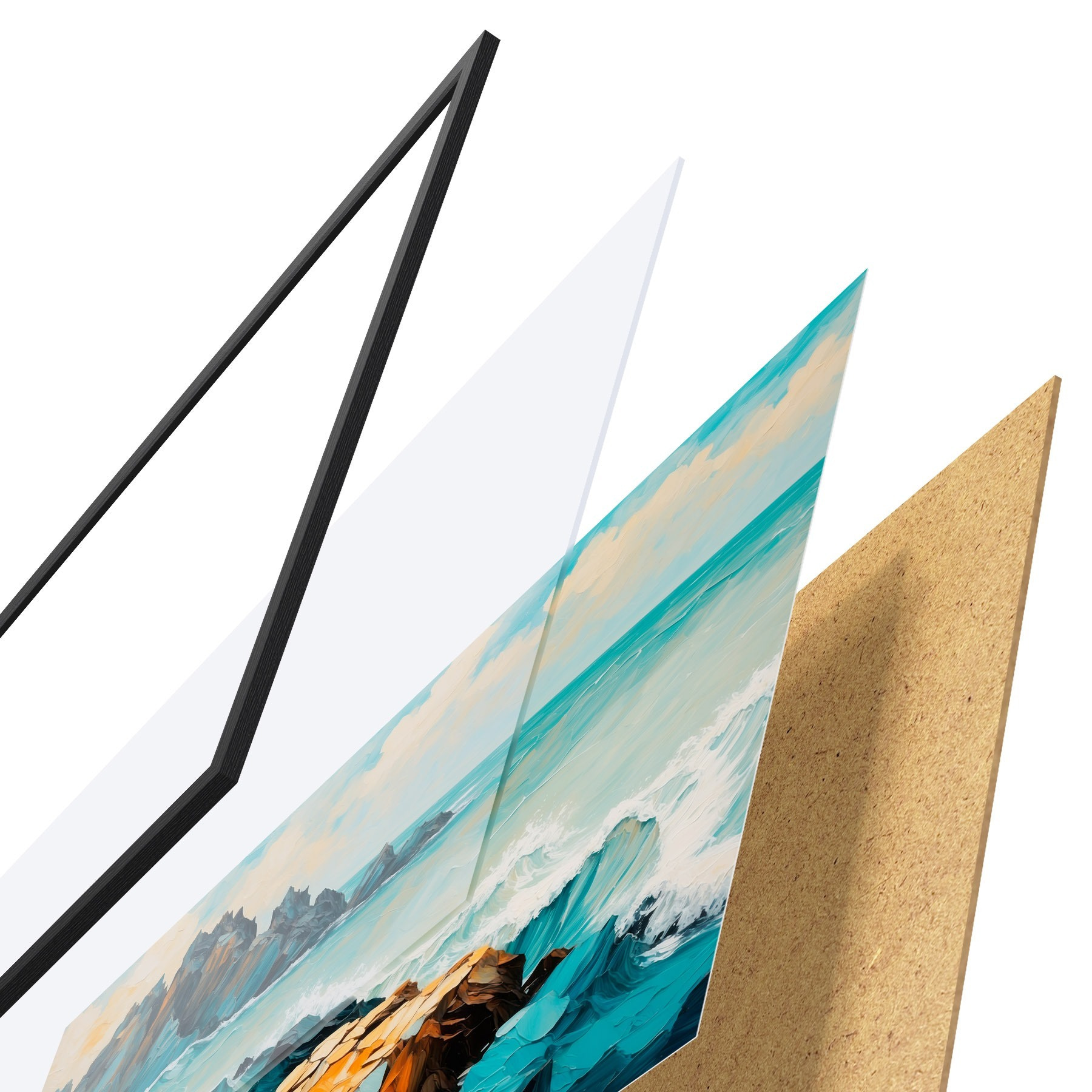 Das Poster besteht aus einem Rahmen, Plexiglas, einem gedruckten Bild und einer Rückwand aus Spanplatten. Dank der Halterungen auf der Rückseite kann das Poster sofort an die Wand gehängt werden.