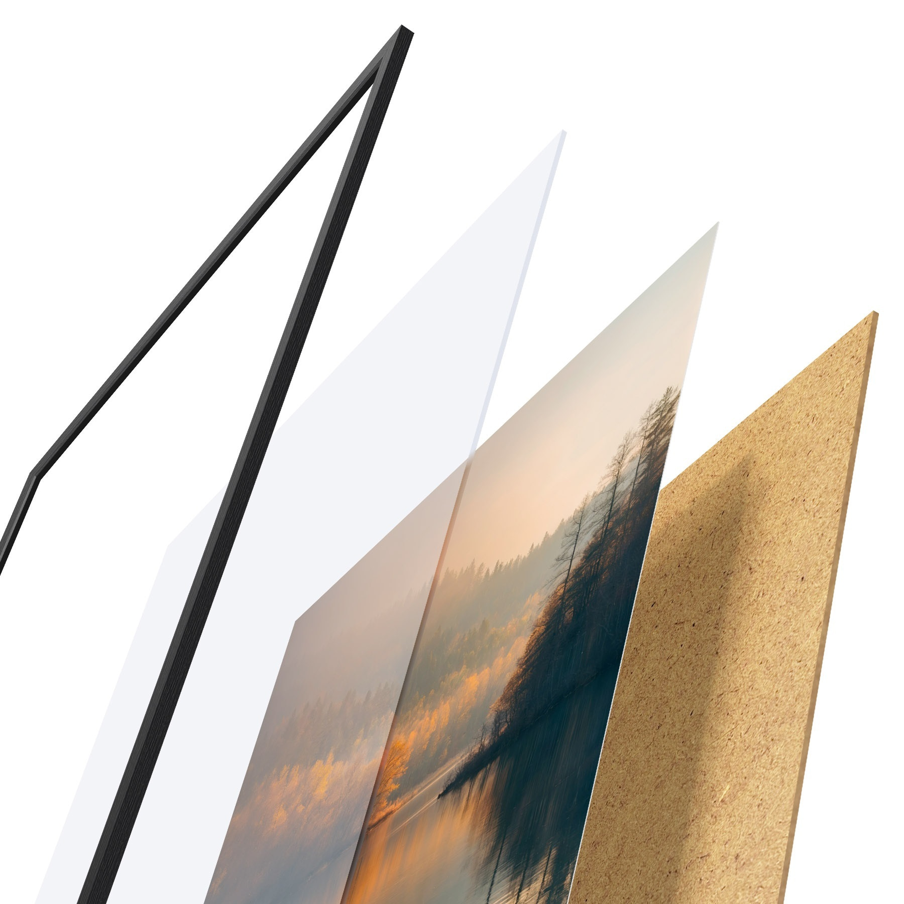 Das Poster besteht aus einem Rahmen, Plexiglas, einem gedruckten Bild und einer Rückwand aus Spanplatten. Dank der Halterungen auf der Rückseite kann das Poster sofort an die Wand gehängt werden.