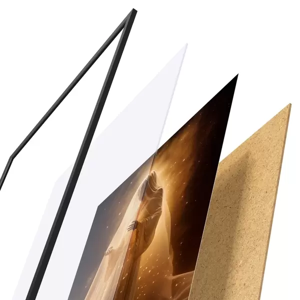 Das Poster besteht aus einem Rahmen, Plexiglas, einem gedruckten Bild und einer Rückwand aus Spanplatten. Dank der Halterungen auf der Rückseite kann das Poster sofort an die Wand gehängt werden.