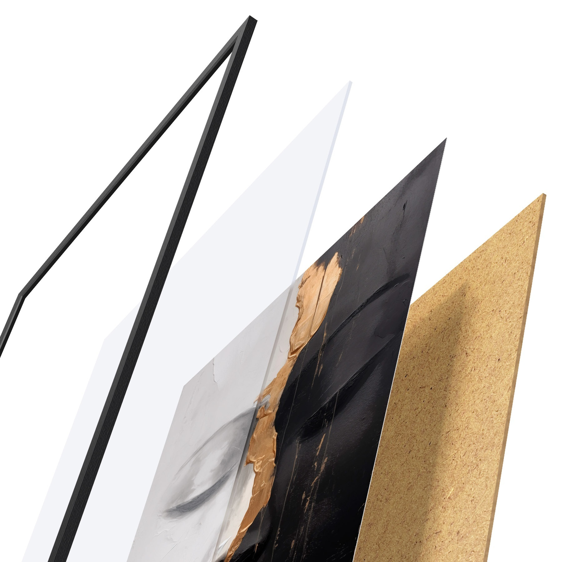 Das Poster besteht aus einem Rahmen, Plexiglas, einem gedruckten Bild und einer Rückwand aus Spanplatten. Dank der Halterungen auf der Rückseite kann das Poster sofort an die Wand gehängt werden.