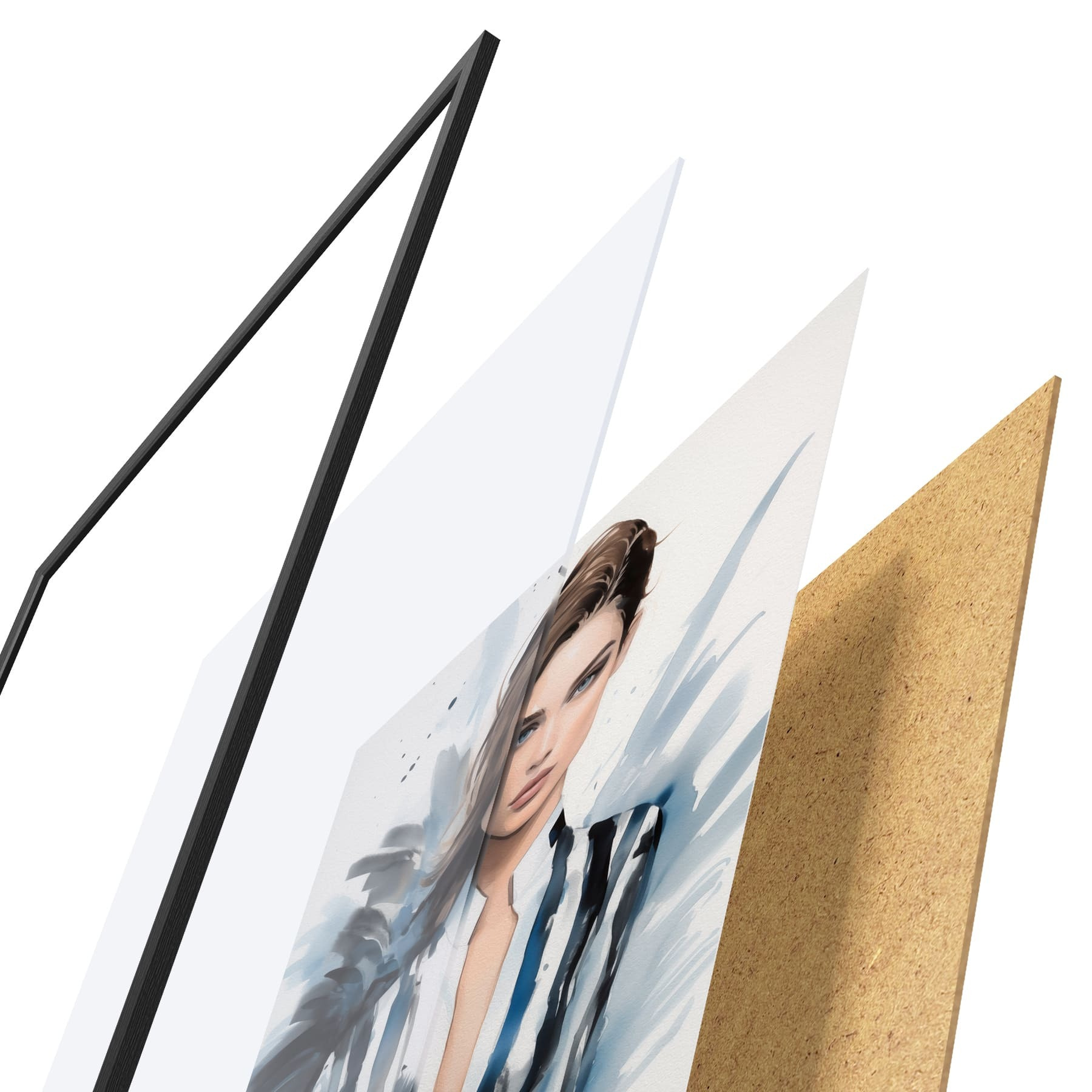Das Poster besteht aus einem Rahmen, Plexiglas, einem gedruckten Bild und einer Rückwand aus Spanplatten. Dank der Halterungen auf der Rückseite kann das Poster sofort an die Wand gehängt werden.