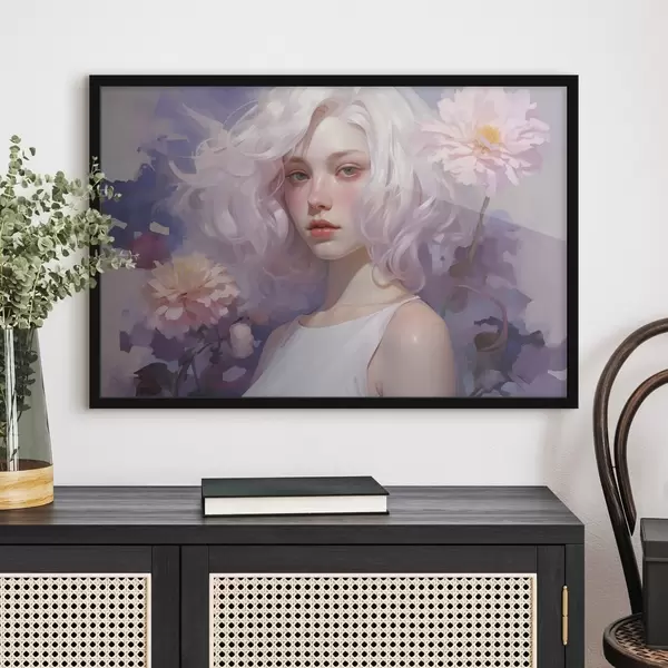 Poster Schönes Mädchen in den Blumen, Acryl-Stil Zeichnung, Japan, lila Farben f43495