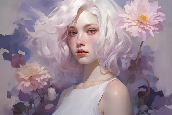 Poster Schönes Mädchen in den Blumen, Acryl-Stil Zeichnung, Japan, lila Farben Nr f43495