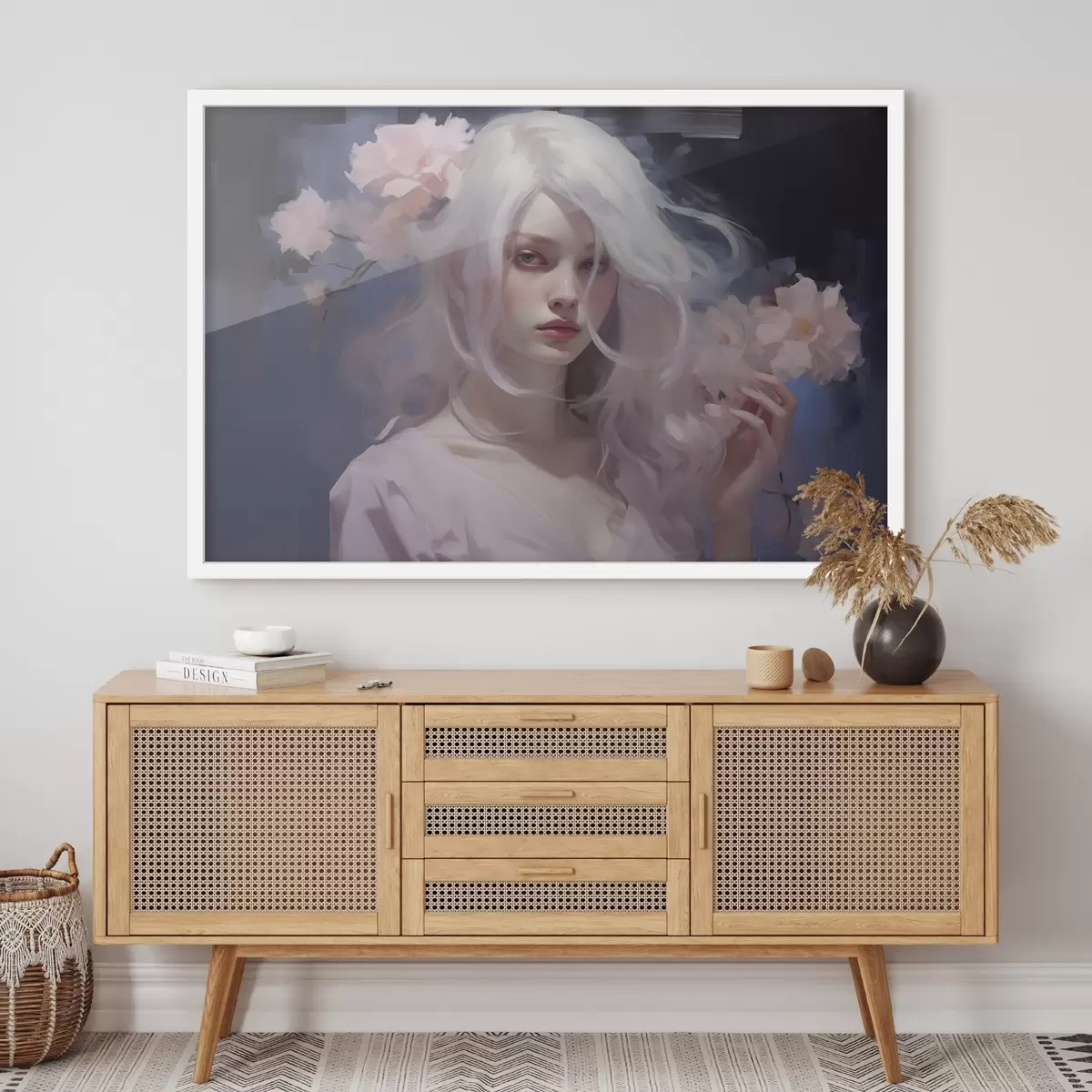Poster Mädchen mit Pfingstrosen, Acryl-Stil Zeichnung, dunkler Hintergrund f43496
