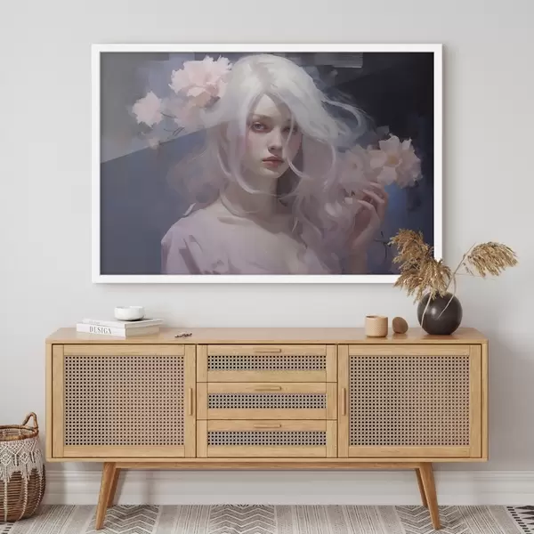 Poster Mädchen mit Pfingstrosen, Acryl-Stil Zeichnung, dunkler Hintergrund Nr f43496