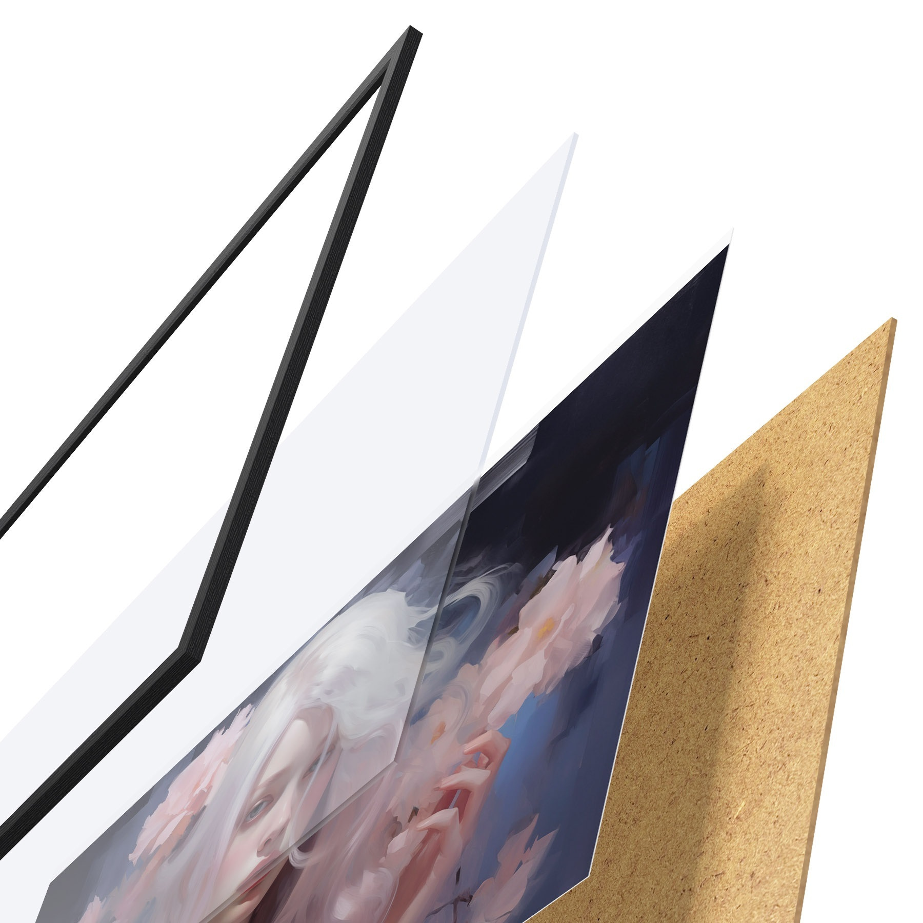 Das Poster besteht aus einem Rahmen, Plexiglas, einem gedruckten Bild und einer Rückwand aus Spanplatten. Dank der Halterungen auf der Rückseite kann das Poster sofort an die Wand gehängt werden.