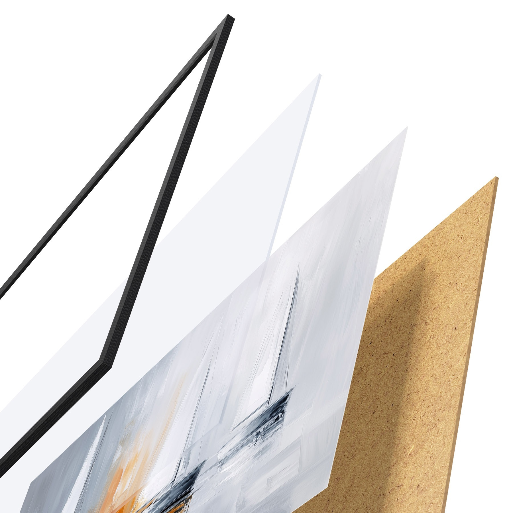 Das Poster besteht aus einem Rahmen, Plexiglas, einem gedruckten Bild und einer Rückwand aus Spanplatten. Dank der Halterungen auf der Rückseite kann das Poster sofort an die Wand gehängt werden.