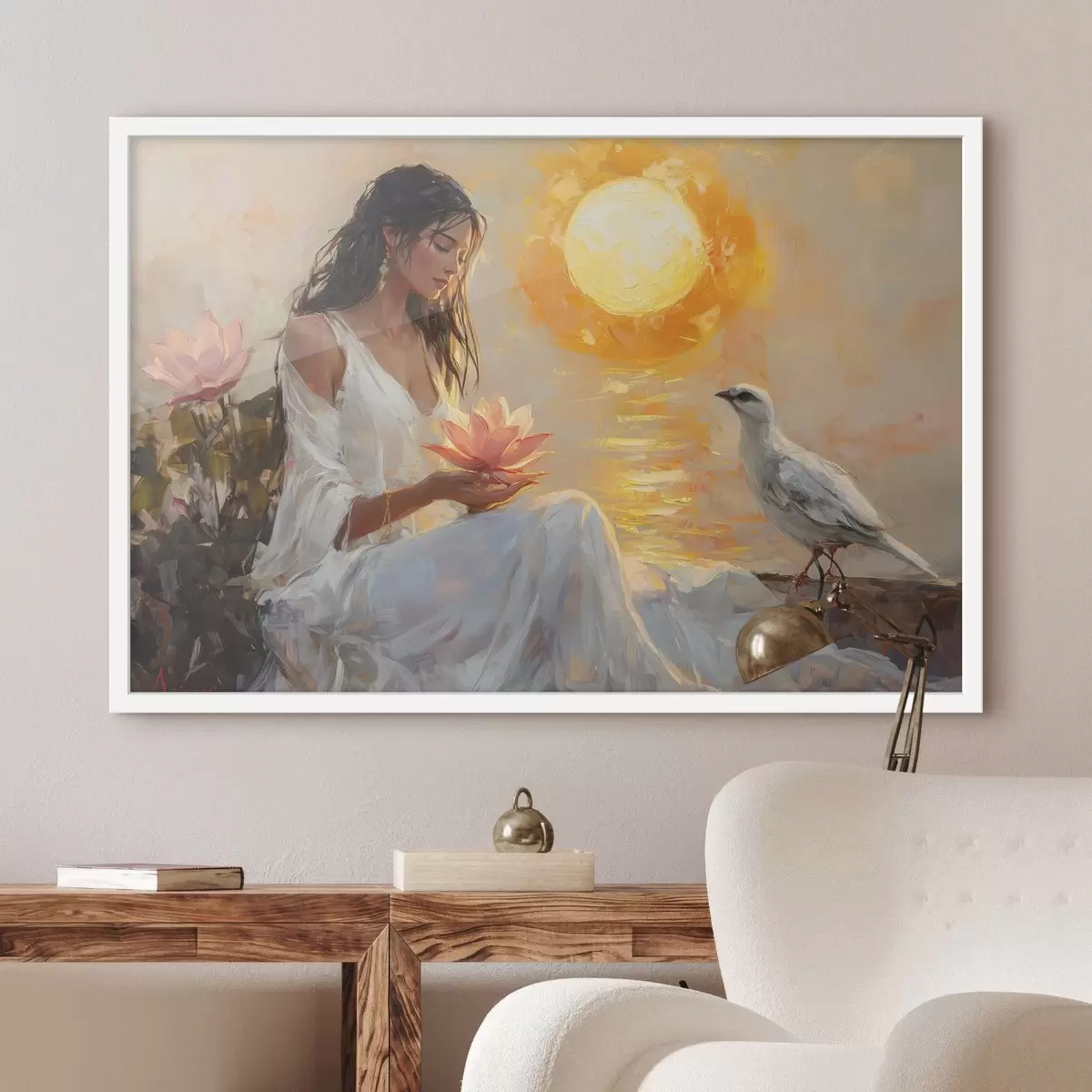 Poster Frau mit Lotosblüte im Sonnenuntergang, weißer Vogel, Ölzeichnung f43501