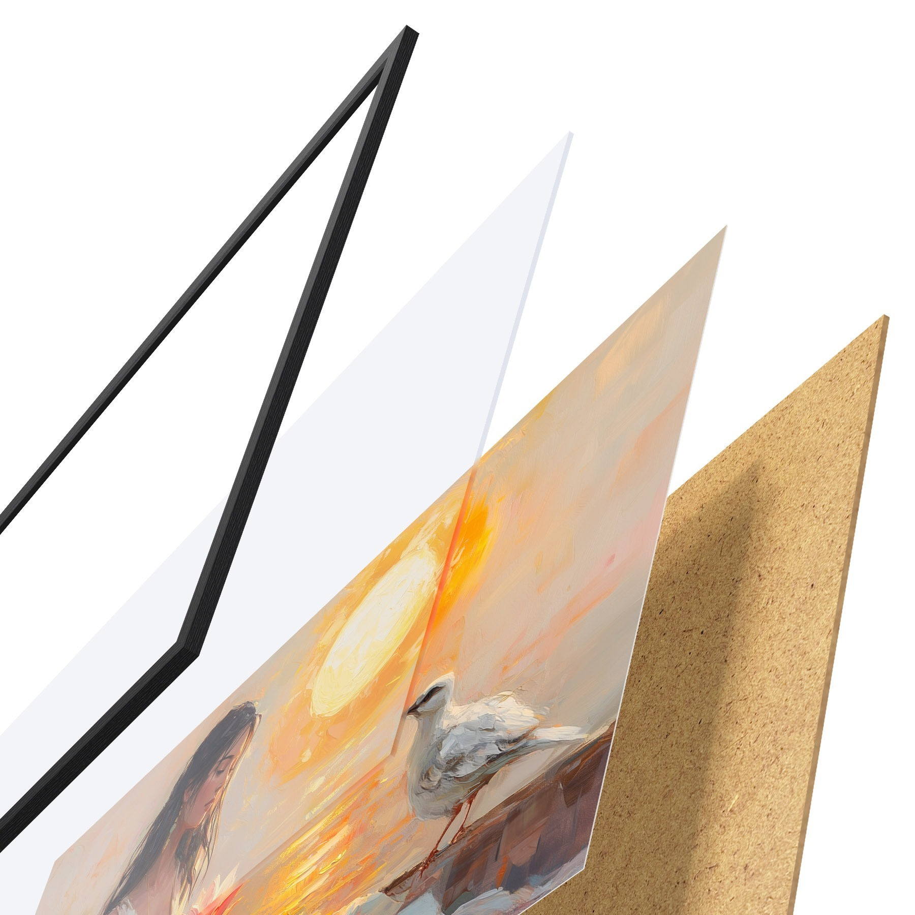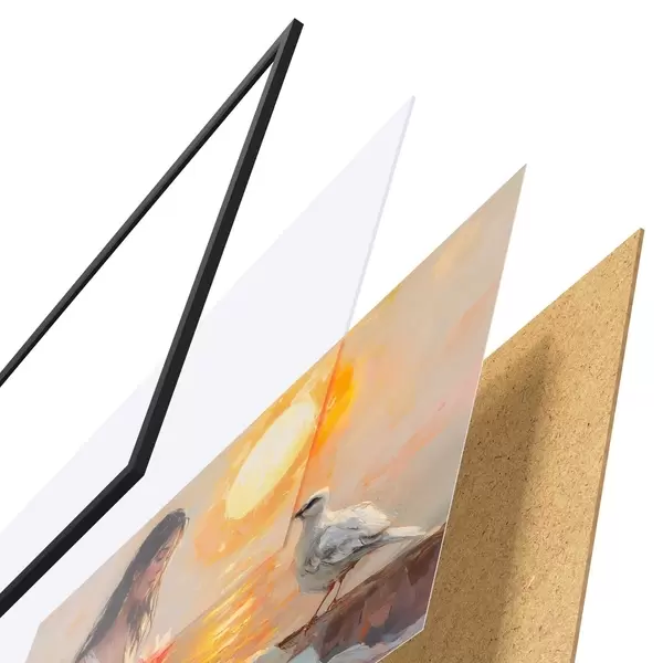 Das Poster besteht aus einem Rahmen, Plexiglas, einem gedruckten Bild und einer Rückwand aus Spanplatten. Dank der Halterungen auf der Rückseite kann das Poster sofort an die Wand gehängt werden.
