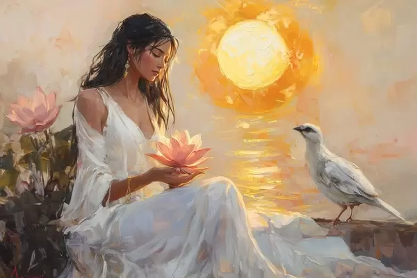 Poster Frau mit Lotosblüte im Sonnenuntergang, weißer Vogel, Ölzeichnung f43501