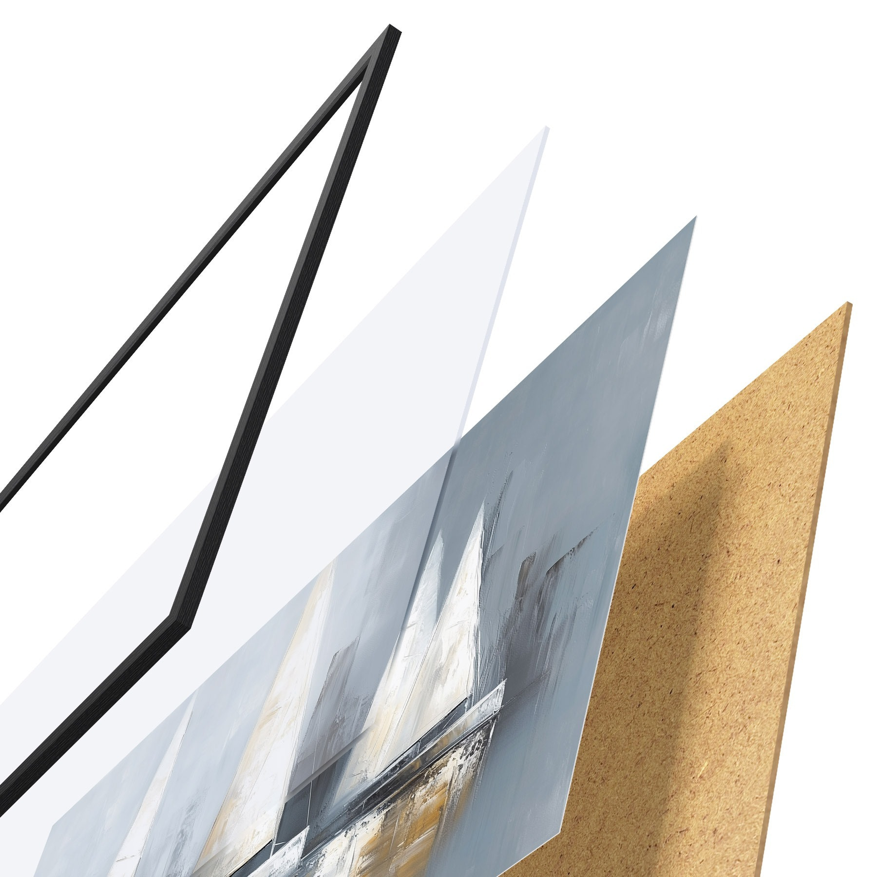 Das Poster besteht aus einem Rahmen, Plexiglas, einem gedruckten Bild und einer Rückwand aus Spanplatten. Dank der Halterungen auf der Rückseite kann das Poster sofort an die Wand gehängt werden.