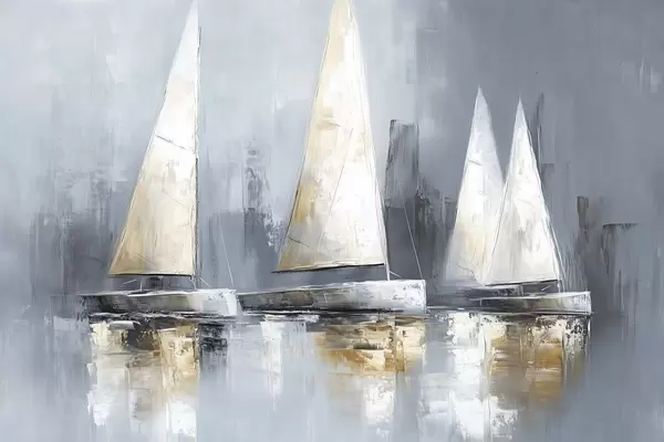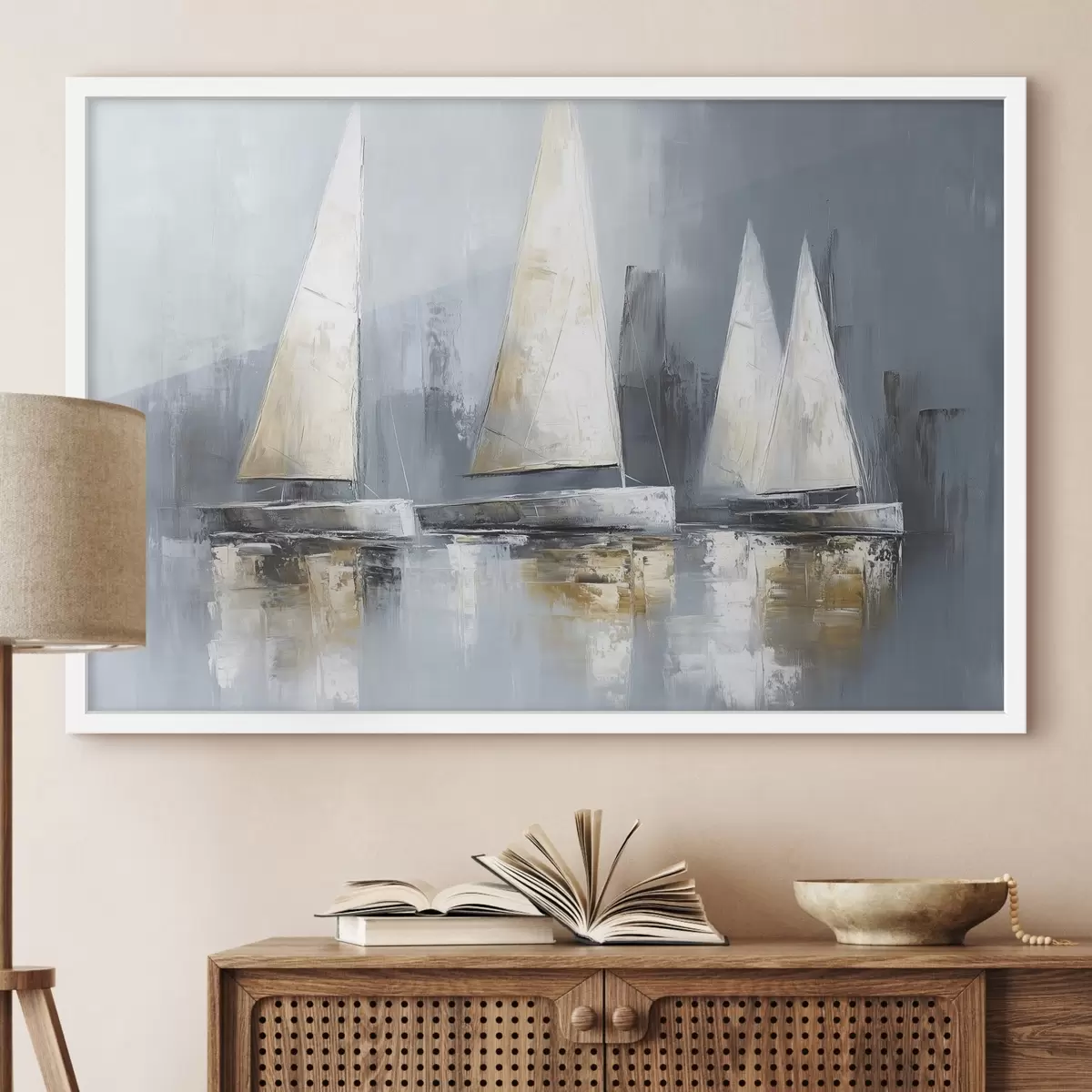 Poster Segelboote mit Spiegelungen im Wasser, Ölzeichnung, graue Farben f43506