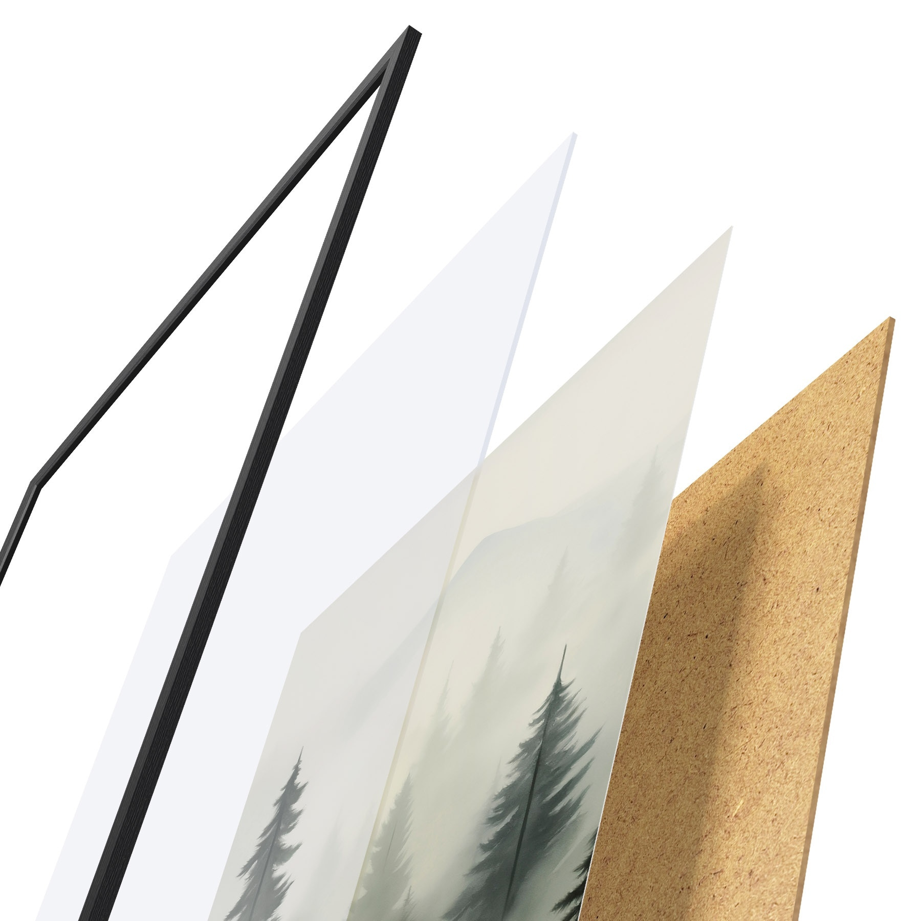 Das Poster besteht aus einem Rahmen, Plexiglas, einem gedruckten Bild und einer Rückwand aus Spanplatten. Dank der Halterungen auf der Rückseite kann das Poster sofort an die Wand gehängt werden.