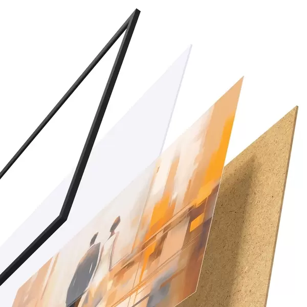 Das Poster besteht aus einem Rahmen, Plexiglas, einem gedruckten Bild und einer Rückwand aus Spanplatten. Dank der Halterungen auf der Rückseite kann das Poster sofort an die Wand gehängt werden.