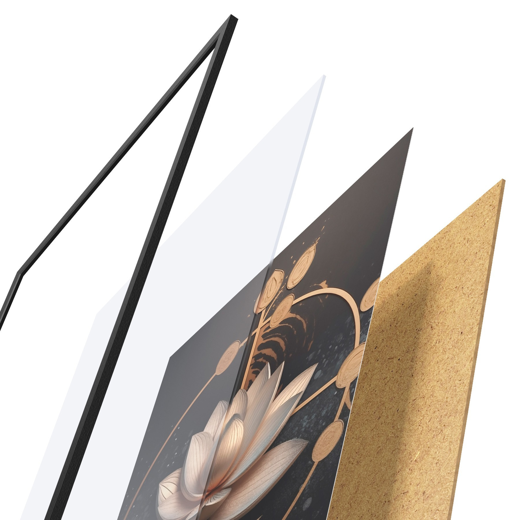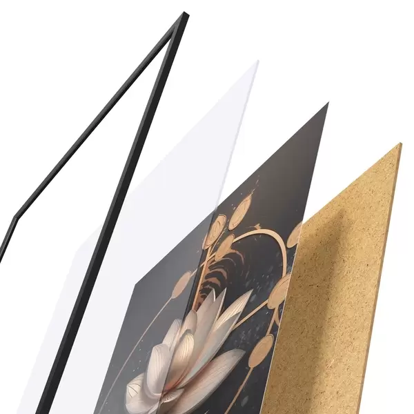 Das Poster besteht aus einem Rahmen, Plexiglas, einem gedruckten Bild und einer Rückwand aus Spanplatten. Dank der Halterungen auf der Rückseite kann das Poster sofort an die Wand gehängt werden.