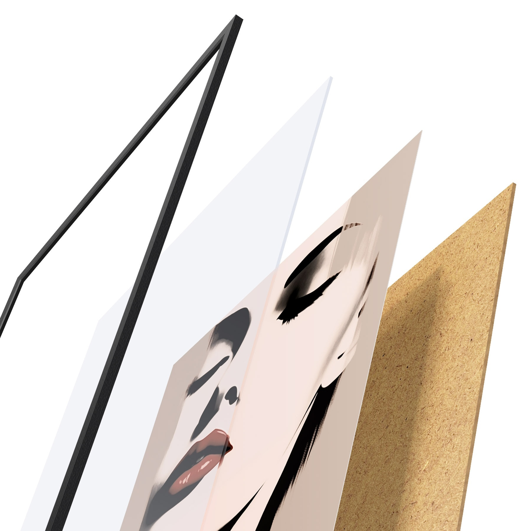 Das Poster besteht aus einem Rahmen, Plexiglas, einem gedruckten Bild und einer Rückwand aus Spanplatten. Dank der Halterungen auf der Rückseite kann das Poster sofort an die Wand gehängt werden.