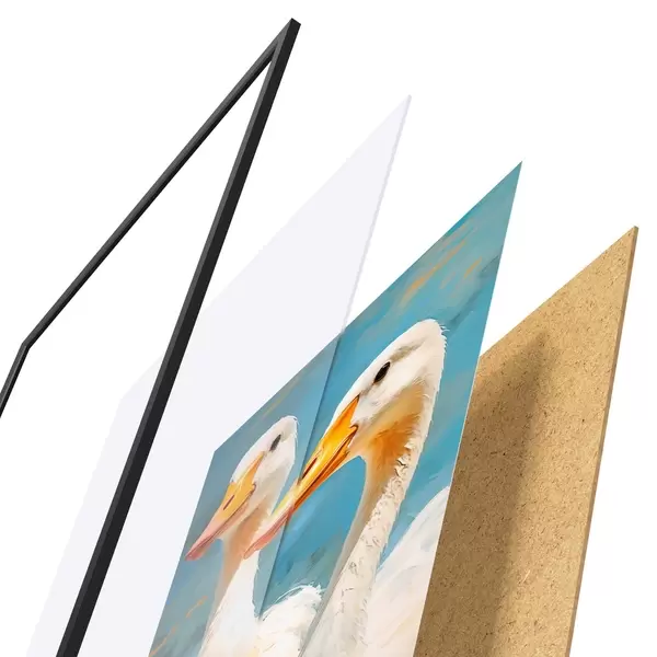Das Poster besteht aus einem Rahmen, Plexiglas, einem gedruckten Bild und einer Rückwand aus Spanplatten. Dank der Halterungen auf der Rückseite kann das Poster sofort an die Wand gehängt werden.