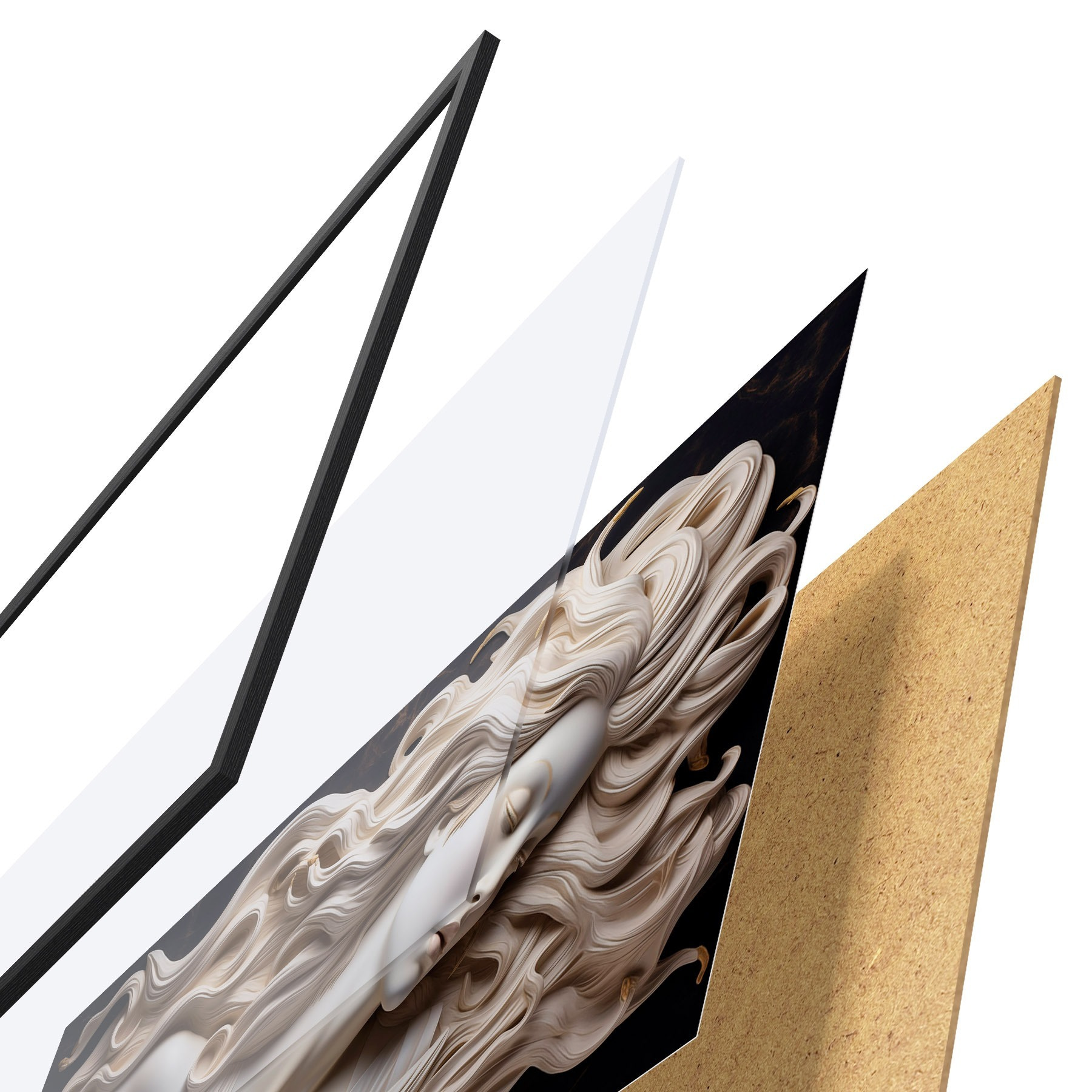 Das Poster besteht aus einem Rahmen, Plexiglas, einem gedruckten Bild und einer Rückwand aus Spanplatten. Dank der Halterungen auf der Rückseite kann das Poster sofort an die Wand gehängt werden.