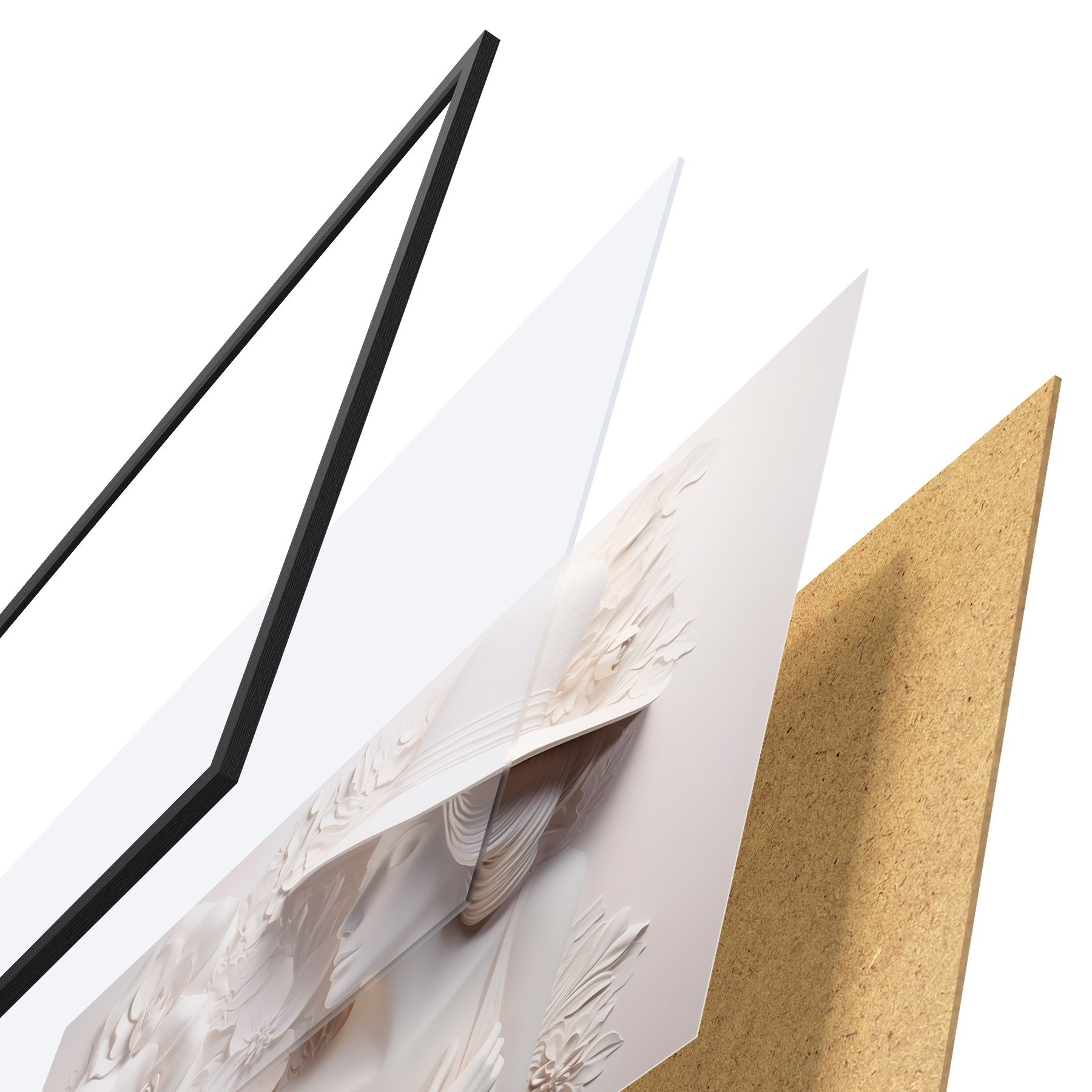 Das Poster besteht aus einem Rahmen, Plexiglas, einem gedruckten Bild und einer Rückwand aus Spanplatten. Dank der Halterungen auf der Rückseite kann das Poster sofort an die Wand gehängt werden.