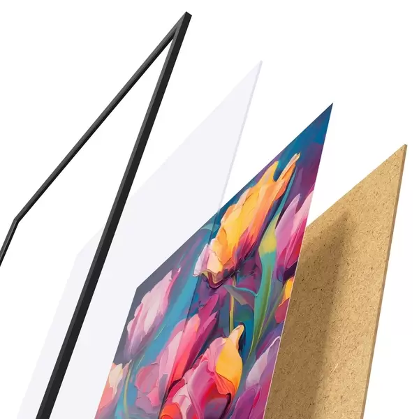 Das Poster besteht aus einem Rahmen, Plexiglas, einem gedruckten Bild und einer Rückwand aus Spanplatten. Dank der Halterungen auf der Rückseite kann das Poster sofort an die Wand gehängt werden.